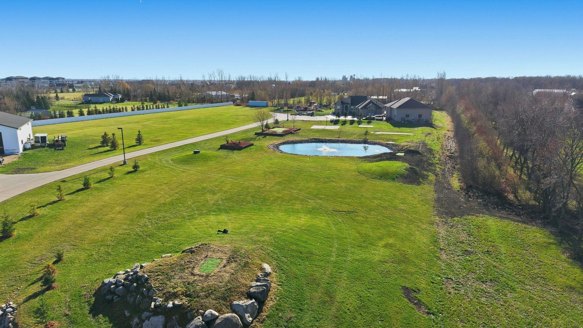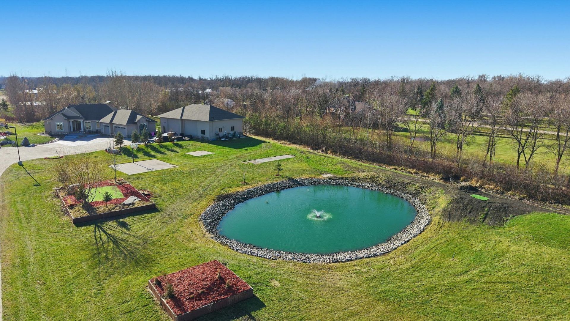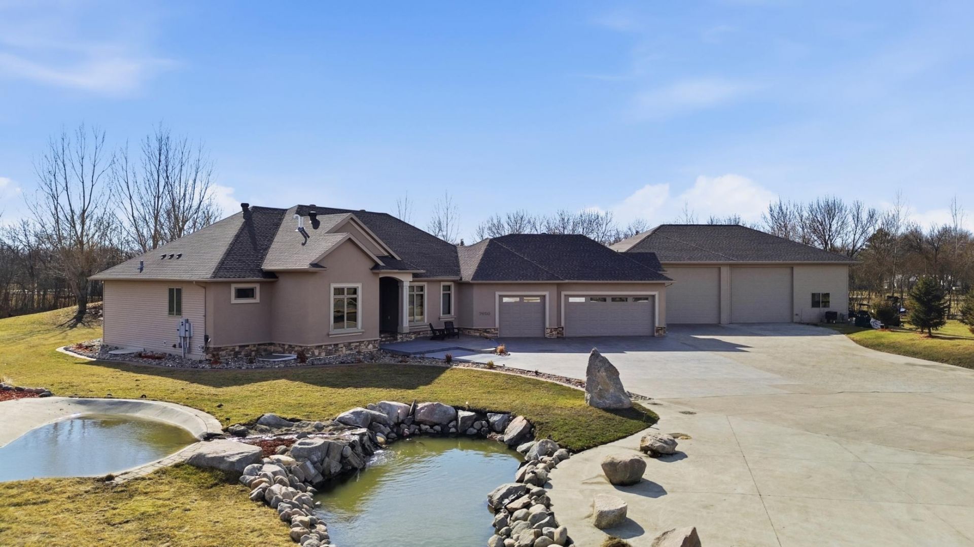Set on nearly 3.5 acres just minutes from Fargo, this extraordinary luxury estate offers the perfect blend of privacy, functionality, and high-end comfort. The beautifully maintained grounds create a true retreat, featuring mature trees, manicured landscaping, decorative rock features, a tranquil waterfall, and a scenic pond, all thoughtfully designed to complement the natural surroundings. With horses allowed and ample open space, the property provides both elegance and versatility. The custom rambler-style home welcomes you with an inviting open-concept floor plan filled with natural sunlight, creating a warm and airy atmosphere throughout the main living spaces. At the heart of the home is a chef's kitchen designed for both everyday living and entertaining, featuring a gas range, double wall ovens, an oversized refrigerator, granite countertops, a large center island with seating, and a spacious pantry. The seamless flow between the kitchen, dining, and living areas makes gatherings effortless. The luxurious primary suite offers a private retreat, complete with a jetted soaking tub, walk-in tile shower, dual vanities, and a spacious walk-in closet. Downstairs, the fully finished basement boasts impressive 9'6 ceilings and expansive living space, including a large theater room with bar seating, ideal for movie nights and entertaining guests. Car enthusiasts and hobbyists will appreciate the oversized heated 3-stall garage along with the incredible 60' x 45' heated shop, constructed with 16' insulated walls and 14' overhead doors for exceptional functionality. The shop also includes a private office, bathroom, loft space, and additional bonus room, perfect for work, recreation, or storage. Additional highlights include efficient geothermal heating for the home and garage, a prepared site for a future second outbuilding, and special assessments under $3,000.